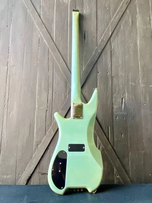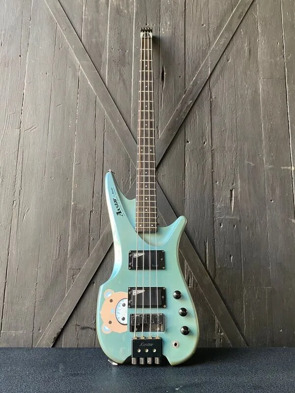 Made in Japan the Ibanez Axstar headless bass was introduced in the mid 80’s. Made in Japan the Axstar series features a tailpiece tuning mechanism located on the body behind the bridge rather than on the headstock. It has a smallish, offset double-cutaway solid alder body with a bolt on maple neck, a 24-fret ebony fingerboard & dot position markers. Electronics include dual Ibanez active Lo ZB humbucking pickups and a fixed bridge. Cosmic Blue finish !